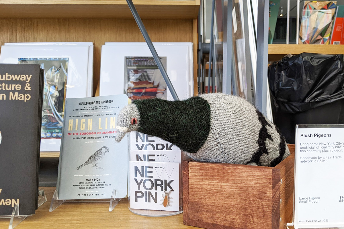 ホイットニー美術館のミュージアムショップでは、アート関連グッズだけでなく、ニューヨークのカルチャーを反映したユニークなアイテムも取り揃えています。その中でも特に目を引くのが、この「Plush Pigeons(ぬいぐるみのハト)」。