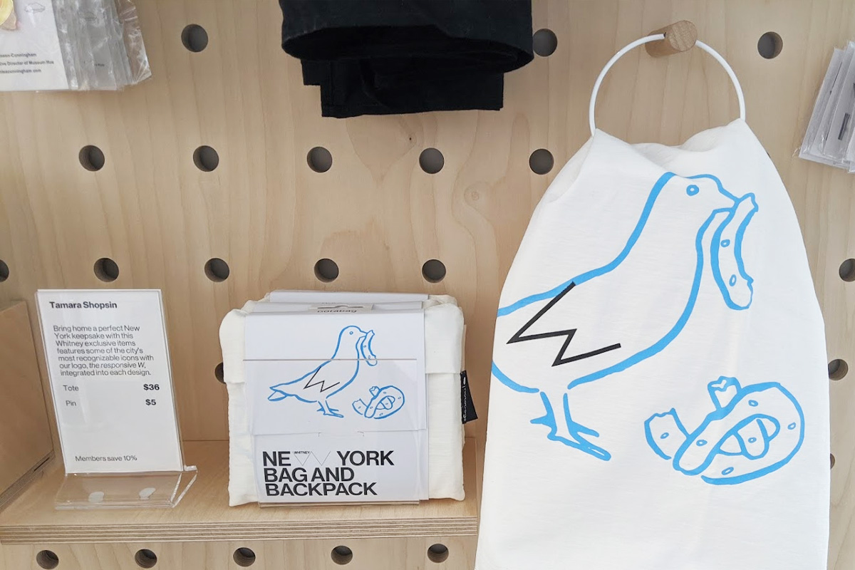 ホイットニー美術館のミュージアムショップには、ニューヨークのストリートカルチャーをユーモラスにデザインしたアイテムが揃っています。その中でも注目したいのが、この「NYピジョン&プレッツェル」デザインのバッグ。